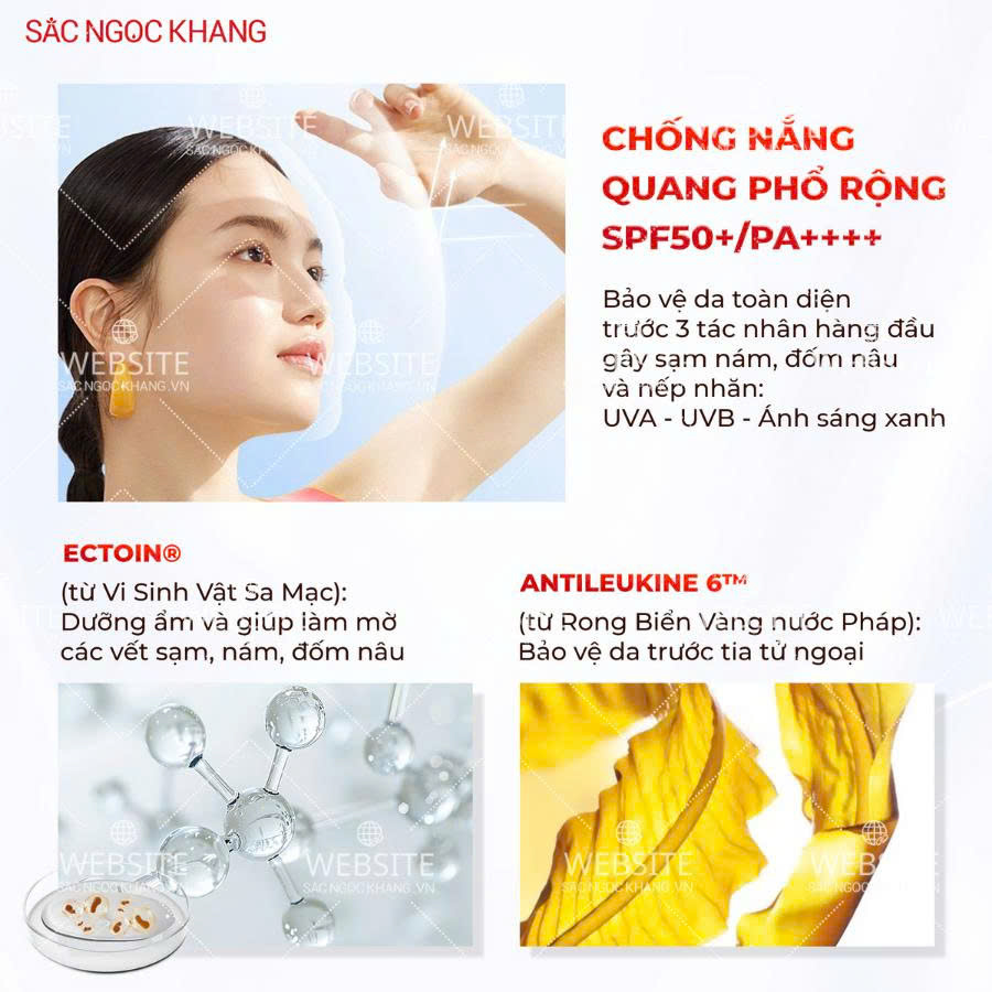 - 6 Tầng Lọc Filter Thế Hệ Mới: Chỉ số SPF50+/PA++++ bảo vệ da toàn diện trước tia UVA1, UVA2, UVB và ánh sáng xanh.