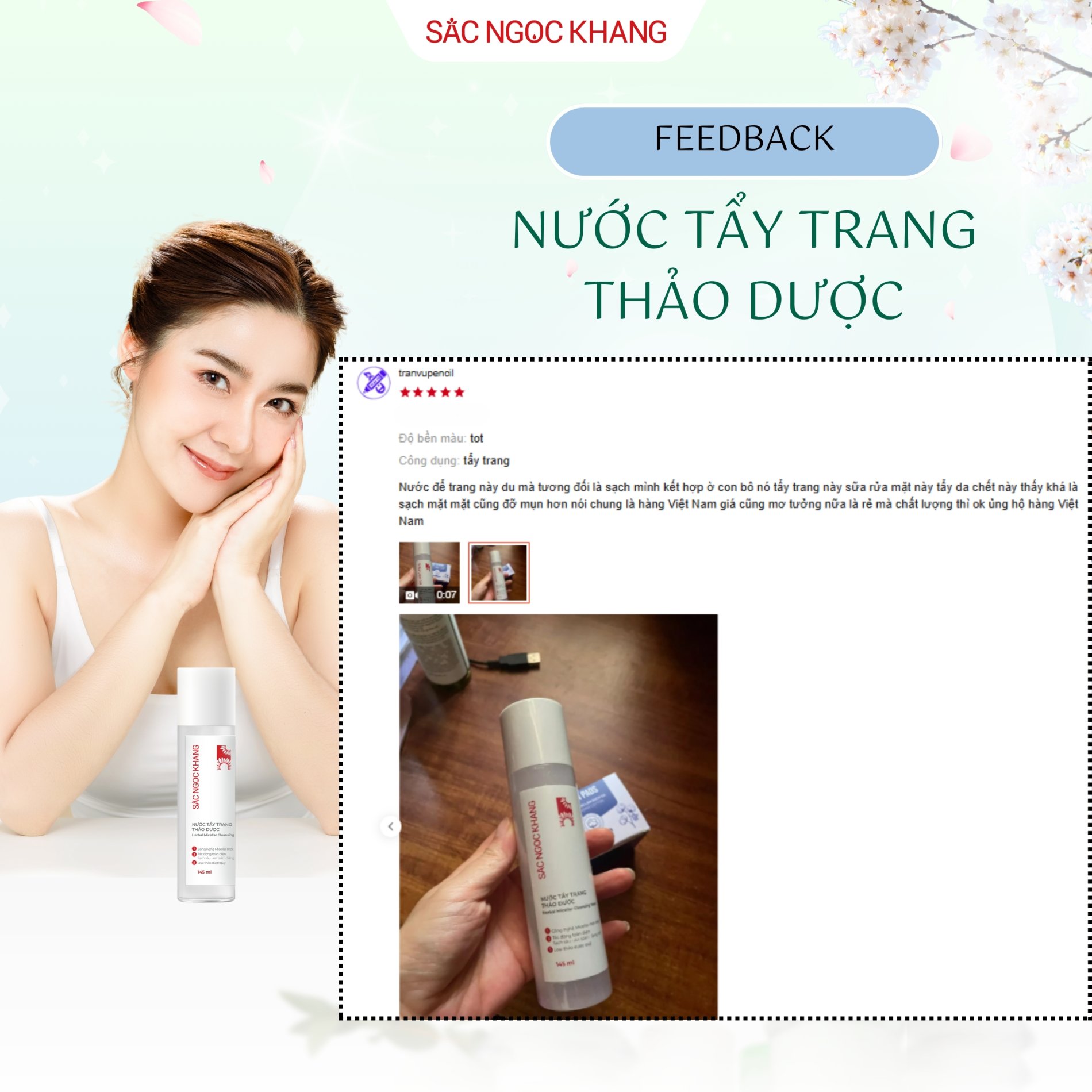 Để ngăn chặn vấn đề này, thì tẩy trang chính là bước không thể thiếu trong quy trình skincare mỗi tối, giúp da được sạch thông thoáng sau một ngày dài hoạt động và là bước “đệm” để các bước dưỡng da tiếp theo đạt hiệu quả tối đa. unv Nước tẩy trang Sắc Ngọc Khang ứng dụng công nghệ tẩy trang Micellar mới nhất, kết hợp cùng 5 loại thảo dược quý trong thiên nhiên: hoa Anh Đào Nhật Bản, hoa Hồng Pháp, rễ Cam Thảo, dầu hạt Hướng Dương, Cà Phê, sẽ giúp nhẹ nhàng loại bỏ lớp trang điểm, bụi bẩn, bã nhờn cho da sạch thông thoáng mà không gây kích ứng hay khô da.